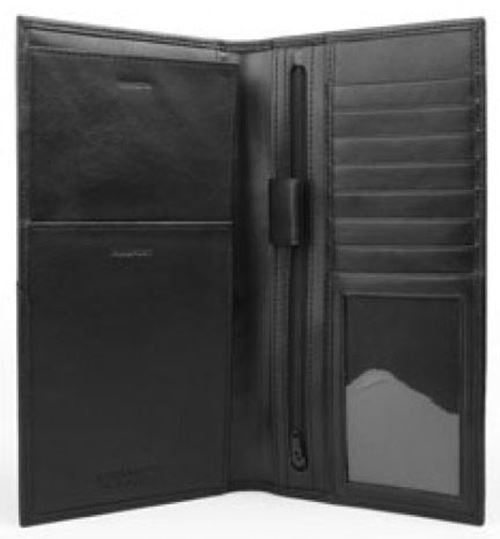 Our Bosca 625-100 Leather Flight Attendent handles all of your classified documents in a slim pocket-size profile. Seperate pockets for boarding pass, ticket and passport plus inside zip compartment. ID window and seven credit card slots too. Beautiful soft matte Black leather!