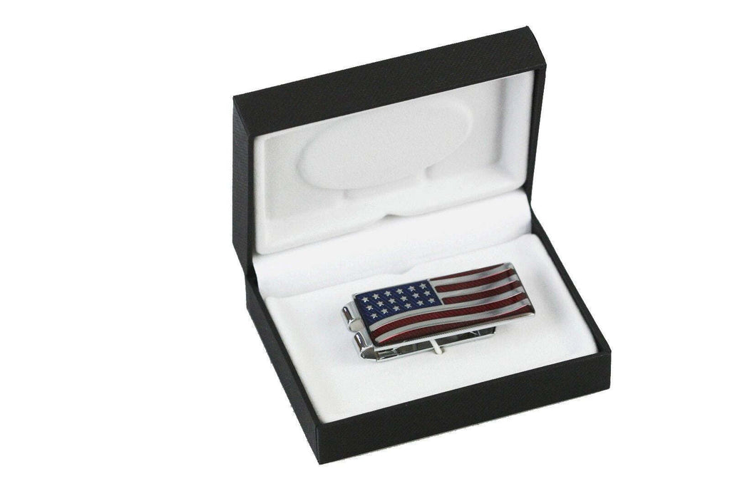 This gorgeous Patriot moneyclip is the perfect way to show the world your love for America!  Featuring a deep-etched facing filled with semi-transparent red and blue lacquer this moneyclip is even more impressive in person than it is in pictures.  The spring-steel clip ensures that this moneyclip will remain snug for years to come and will not stretch out.  Complete with a high-quality box this moneyclip also makes a perfect gift for the Patriot in your life.